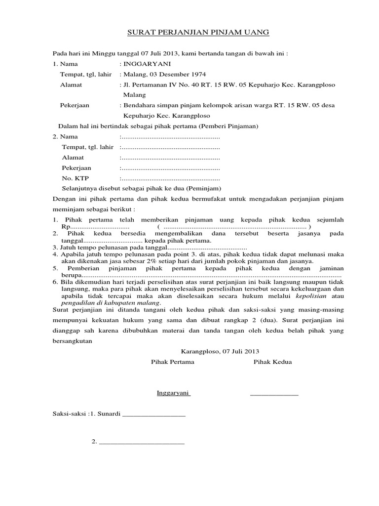 Orin Fadli Umur. Simak ulasan berikut untuk mengetahui lebih lengkap tentang surat penjanjian pinjaman. Kami Bapak Suparyono beserta istri ingin mengajukan lagi pinjaman di Biro Program Kemitraan PT.